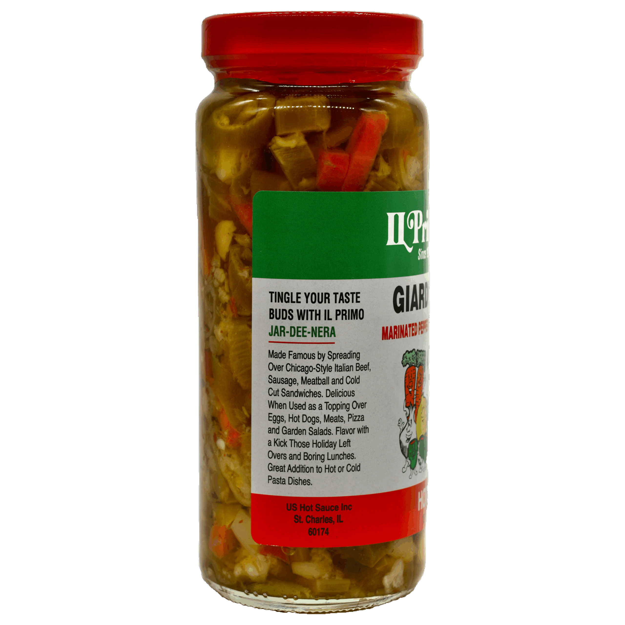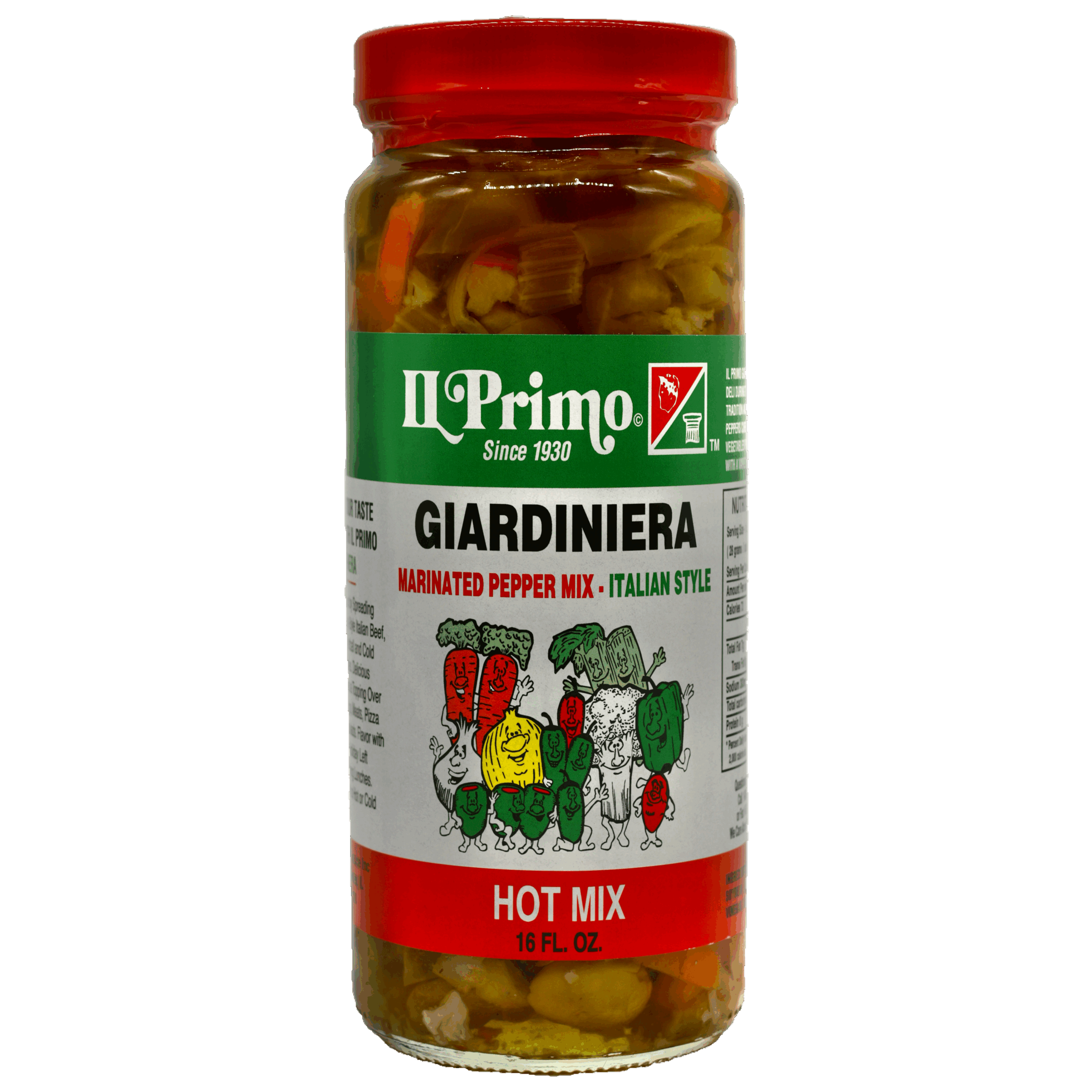 Experience the authentic taste of Chicago with IL Primo Giardiniera. Perfectly blending hot and mild peppers, crisp vegetables, and a mix of spices, this “jar-dee-nera” is a versatile condiment that transforms everyday meals. Ideal for adding a zesty kick to Italian beef, sandwiches, eggs, pizza, and more. Step your meals up a notch with IL Primo!