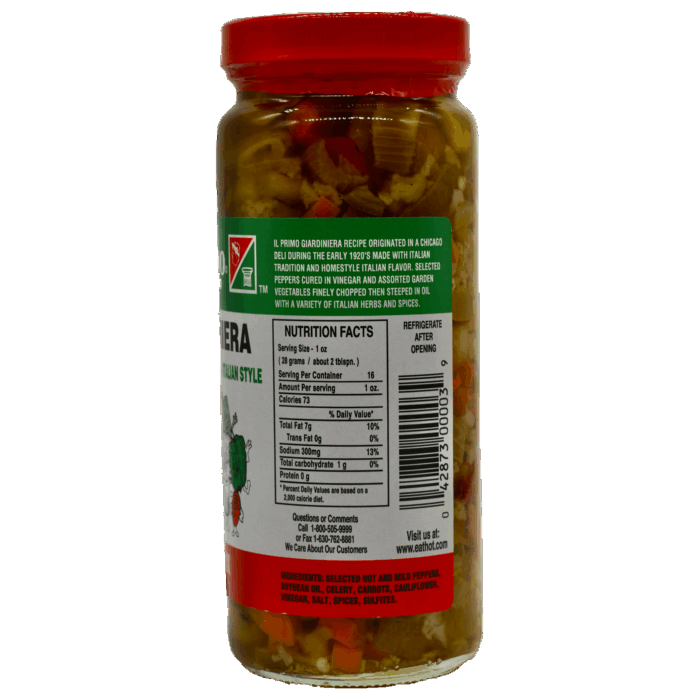 Step into the flavorful world of IL Primo Giardiniera, where each jar brings the essence of Chicago’s iconic culinary tradition to your table. Made from a selection of carefully chosen hot and mild peppers, combined with crunchy celery, carrots, and cauliflower, this giardiniera is more than just a condiment – it’s a celebration of taste.