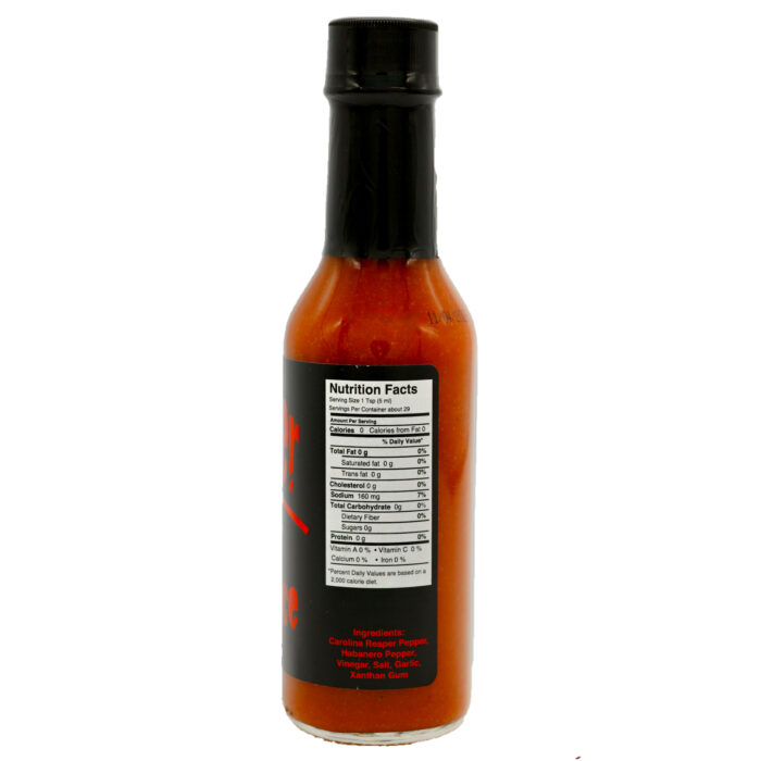 Ingredients: Carolina Reaper Pepper, Habanero Pepper, Vinegar, Salt, Garlic, Xantham Gum