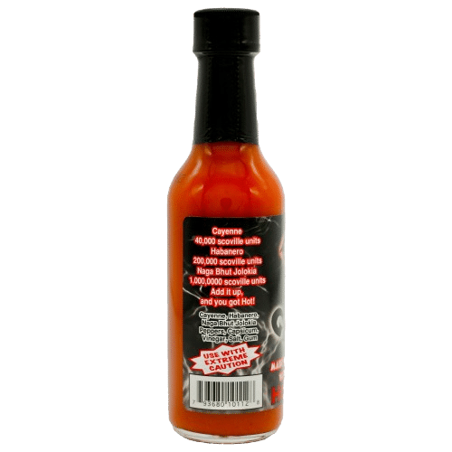 Ingredients: Cayenne, Habanero, Naga Bhut Jolokia Peppers, Capsicum, Vinegar, Salt, Gum