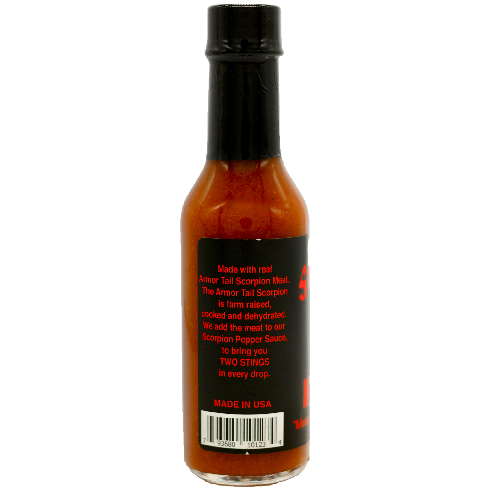 Made with real Armor Tail Scorpion meat!  The Armor Tail Scorpion is farm-raised, cooked, and dehydrated.  We add the meat to our Scorpion Pepper Sauce to bring you TWO STINGS in every drop.  Made in the USA.